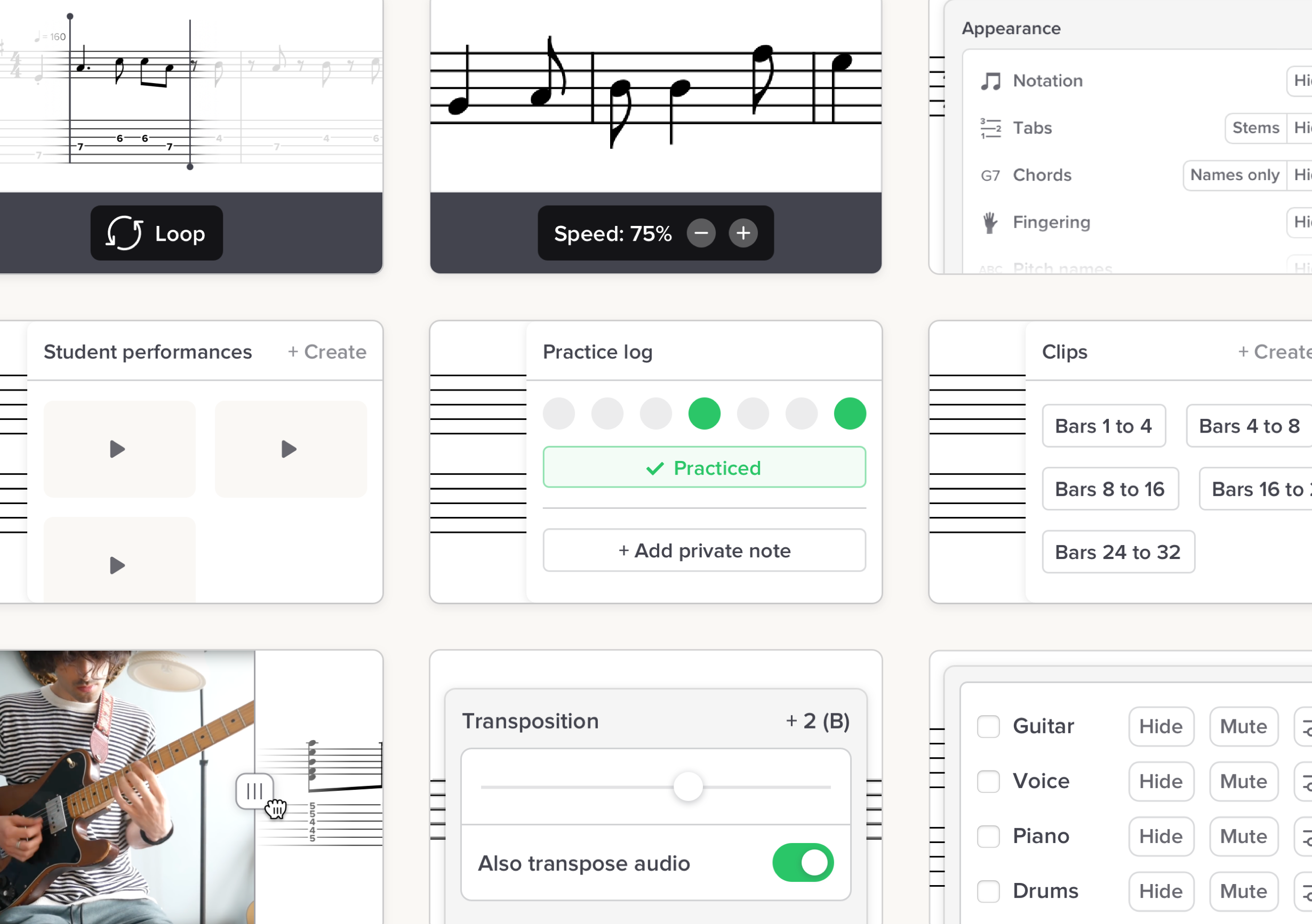 With the Teacher plan, your students automatically get Soundslice features they’d otherwise have to pay for: clips, auto-saved settings and private notes.