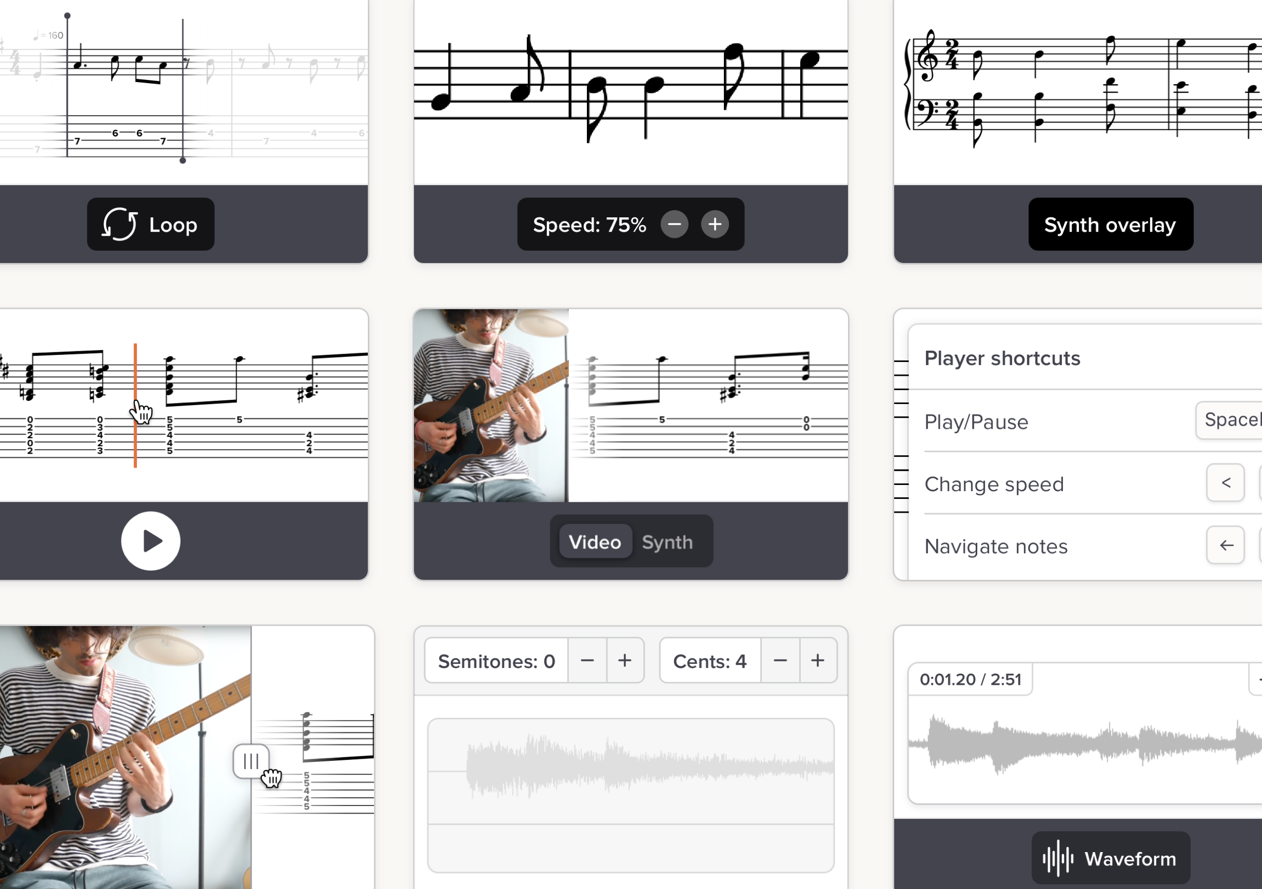 With Soundslice, you create something more interesting than sheet music. You create an interactive practice environment that integrates notation with real human performances and learning tools.