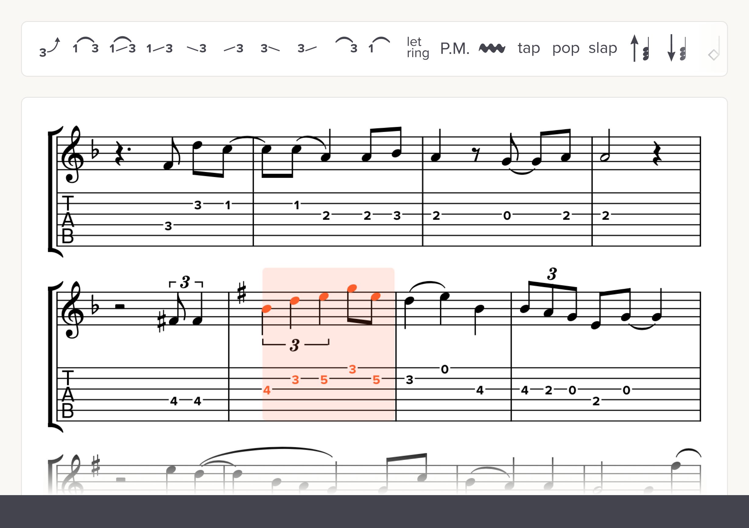 Finally, web-based notation software that treats tablature with respect. We natively support nearly every kind of tab marking: bends, slides, harmonics, tapping and more. No need to hack around your notation software to make proper tab.