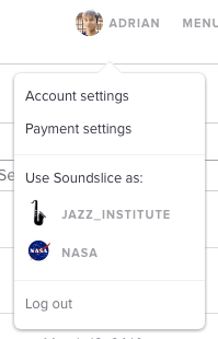 Instead of sharing passwords, you can use our new organizations feature. With it, you can share scores across Soundslice accounts, and easily switch between them: