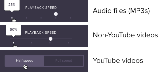 The YouTube player traditionally has allowed only 50% and 100% speeds — so we customized our interface to reflect that. For non-YouTube videos, we support any arbitrary speed down to 50%. For audio files, if you’re using a modern browser, we support any speed down to 25%.