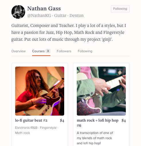 Did you know you can create and sell your own lessons and transcriptions on Soundslice? We have a section of our store dedicated to community-created courses. You’ll also see any such course listed on the channel of its creator (as in the neighboring photo). If you’re comfortable creating slices and you’re interested in making instructional content, check out our guide on selling courses.