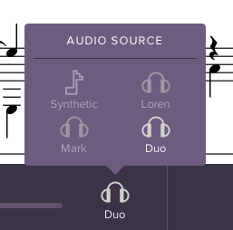“Duo” is the original studio recording. Choose “Loren” or “Mark” for the individual guitar parts. As always, we also have a “Synthetic” version that generates MIDI audio based on the notation; it’s useful if you want to play it really slowly while hearing the correct notes.